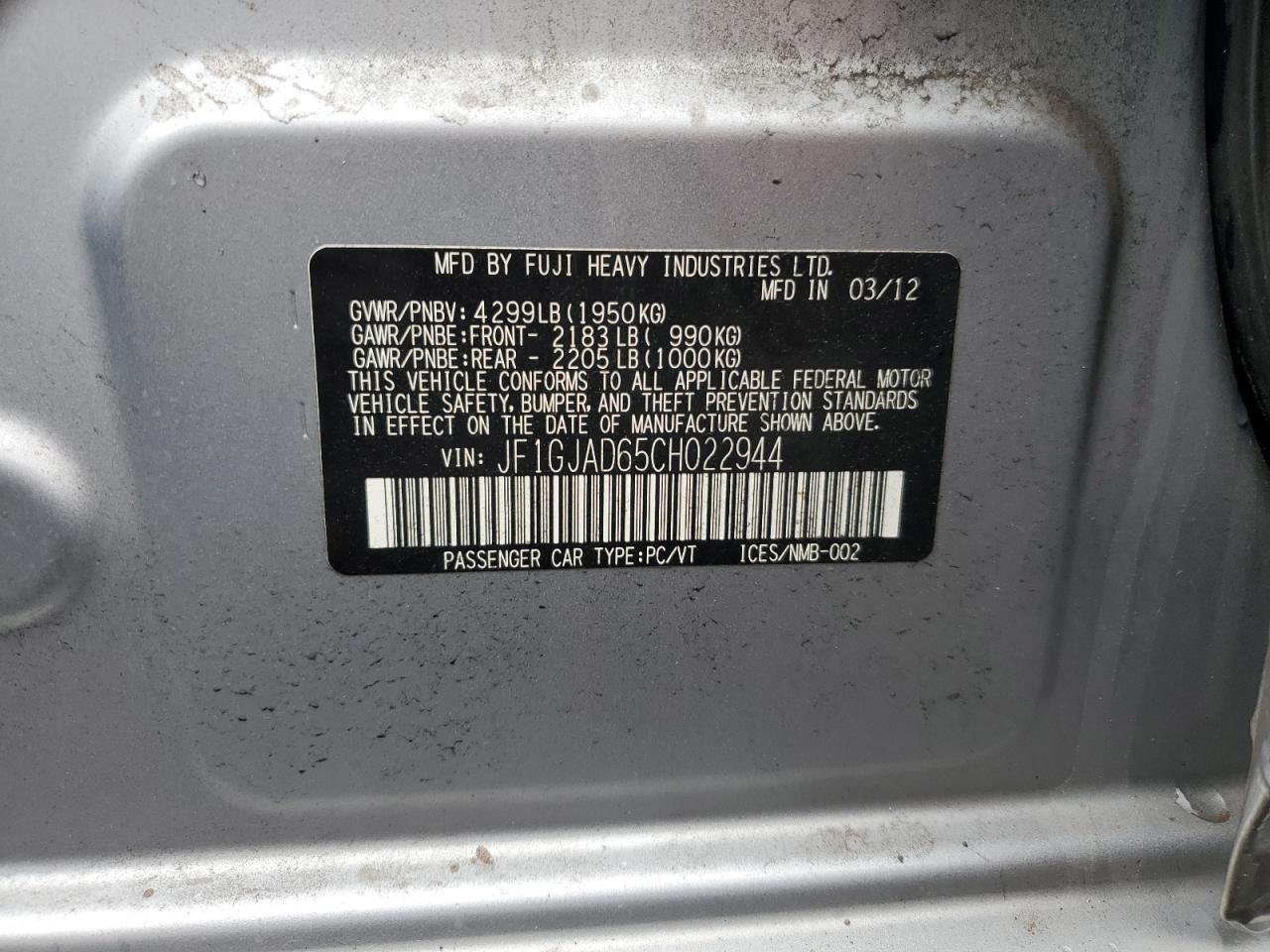 Колір СрібнийЦиліндри 4Привід Повний привідVIN JF1GJAD65CH022944Стан НевідомоУшкодження Передня або задня