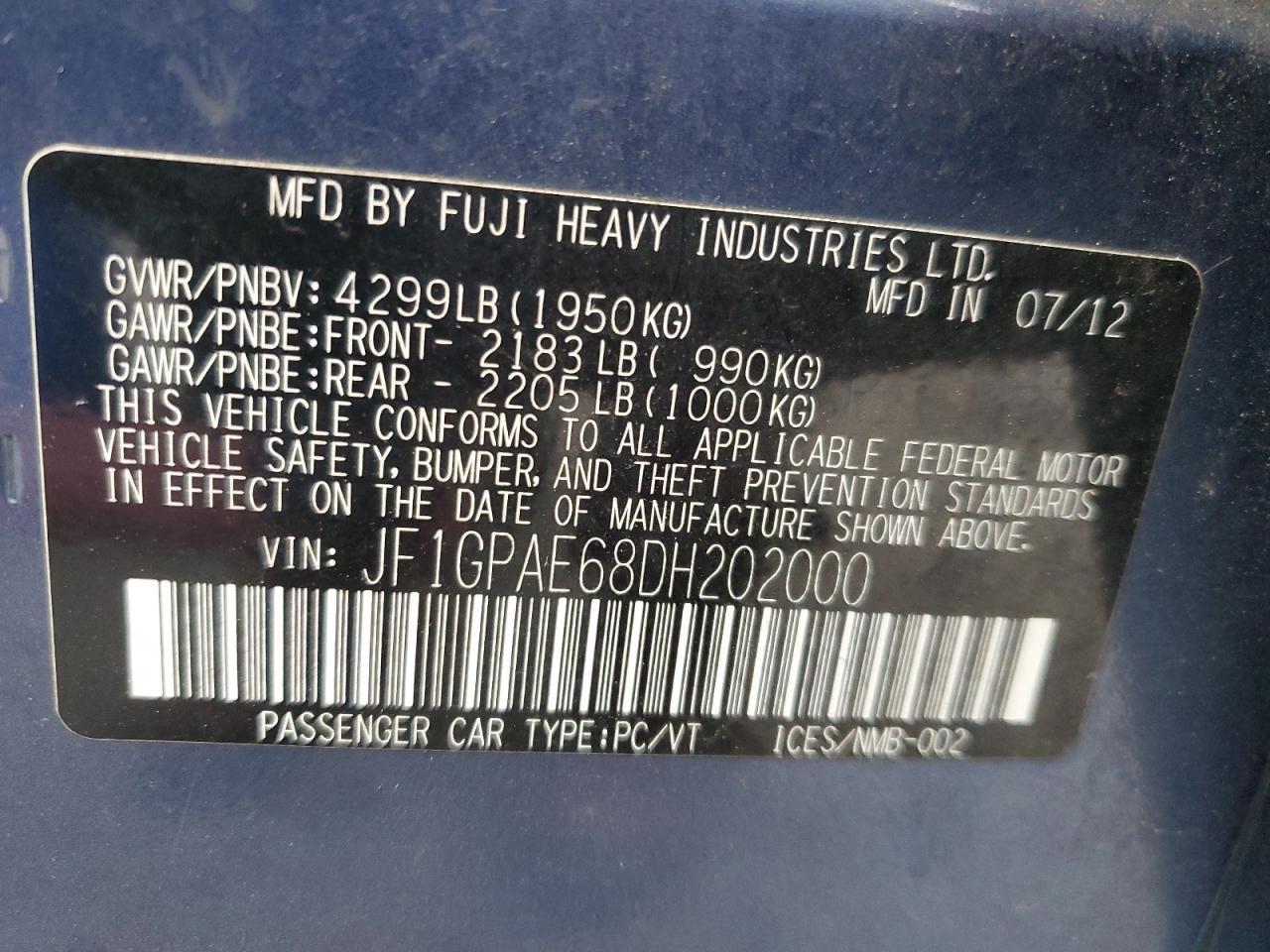 SUBARU IMPREZA 2.0 2013 р.в., Повний привід (JF1GPAE68DH202000) з США
