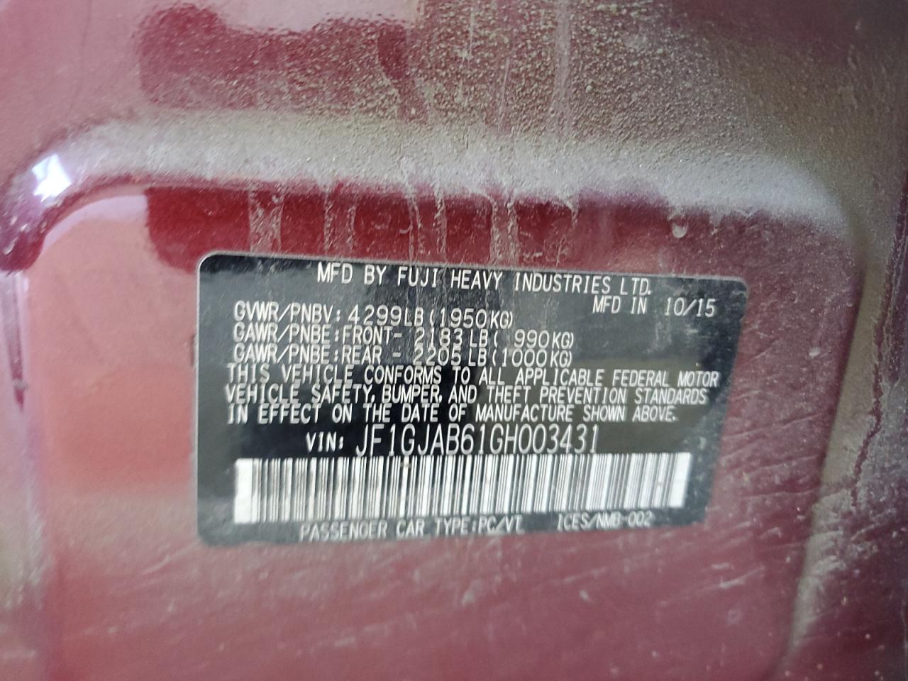 Колір БордовийЦиліндри 4Привід Повний привідVIN JF1GJAB61GH003431Стан Заводиться та їде (перевірено)Ушкодження Передня або задня