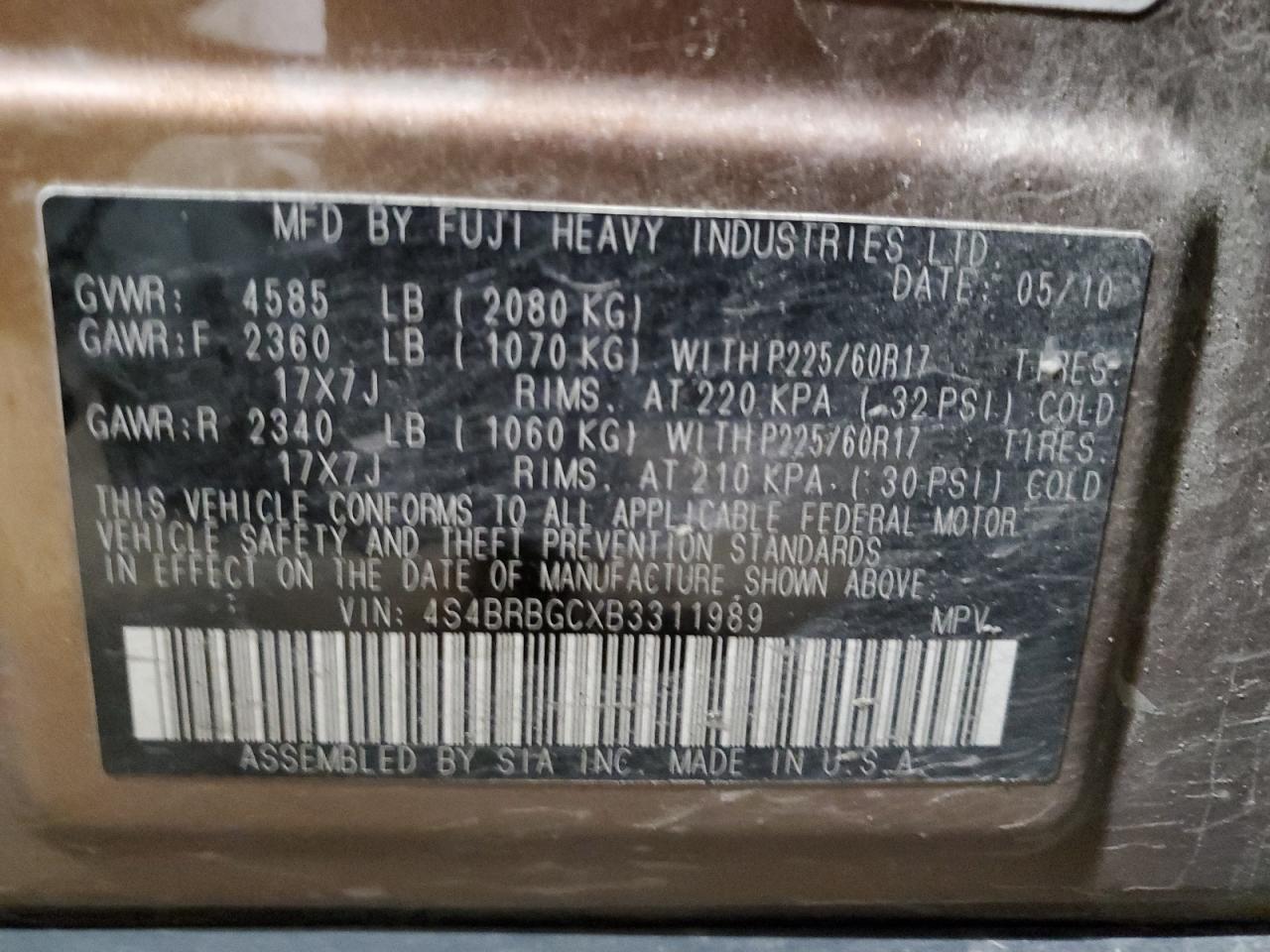 Колір ЗолотийЦиліндри 4Привід Повний привідVIN 4S4BRBGCXB3311989Стан НевідомоУшкодження Передня або задня