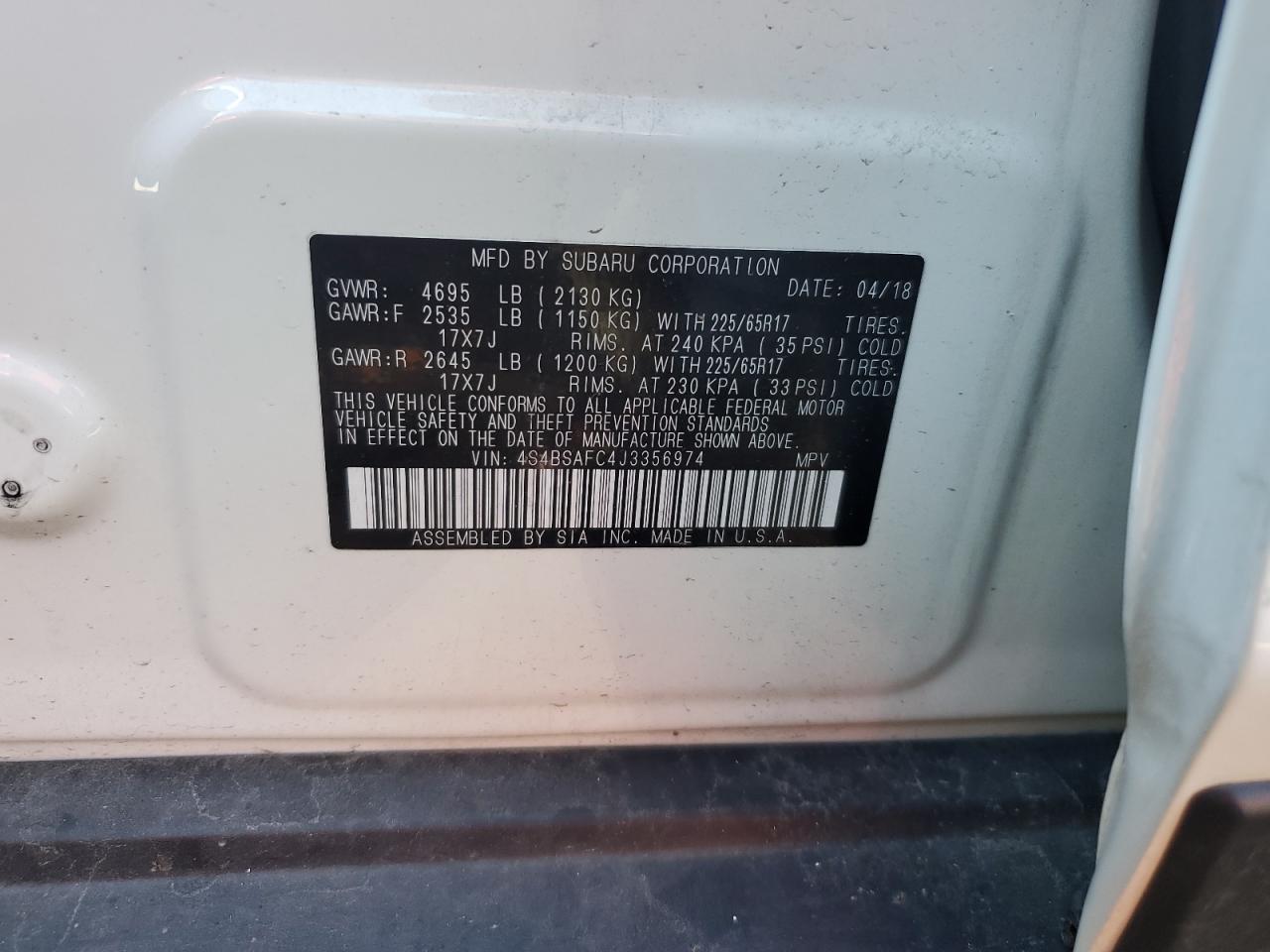 Колір БілийЦиліндри 4Привід Повний привідVIN 4S4BSAFC4J3356974Стан Заводиться та їде (перевірено)Ушкодження Передня або задня