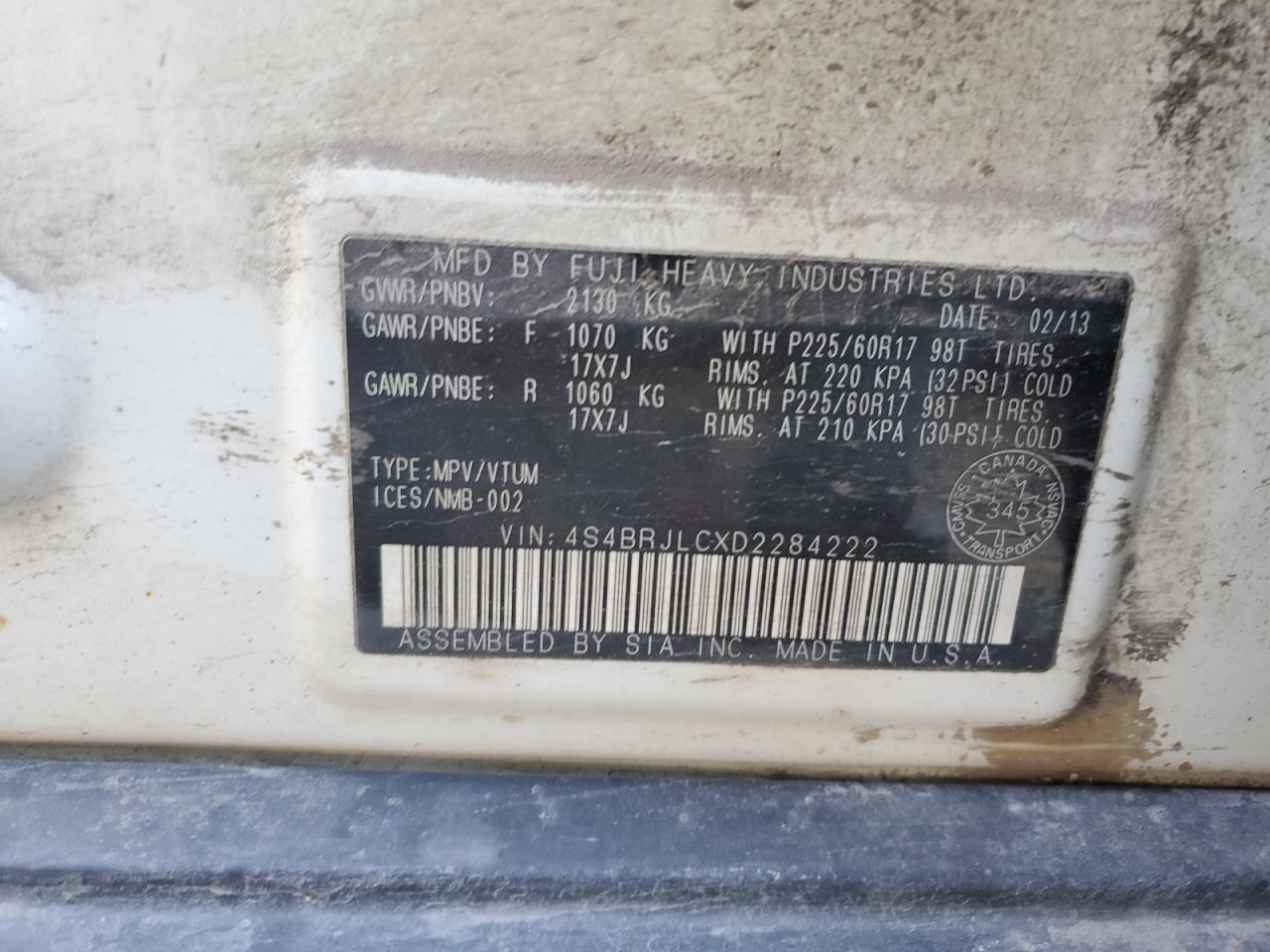 SUBARU OUTBACK 3.6 2013 р.в., Повний привід (4S4BRJLCXD2284222) з США