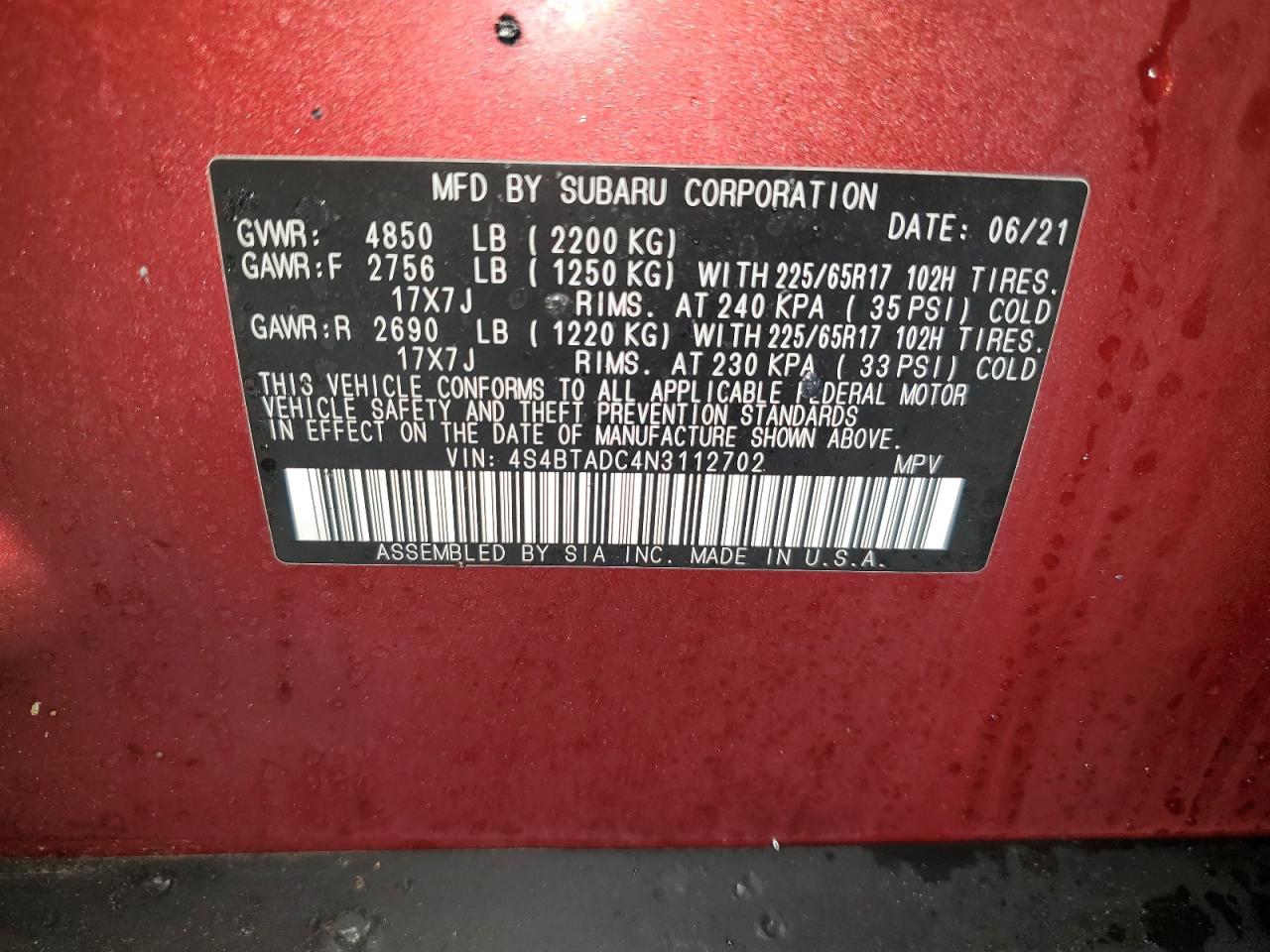 Колір БордовийЦиліндри 4Привід Повний привідVIN 4S4BTADC4N3112702Стан НевідомоУшкодження Пожежа
