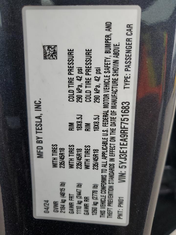 TESLA MODEL 3 2024 р.в., Задній привід (5YJ3E1EA9RF751683) з США