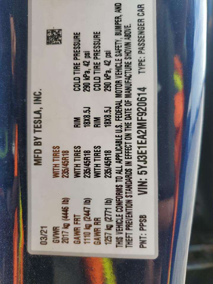 TESLA MODEL 3 2021 р.в., Задній привід (5YJ3E1EA2MF920614) з США