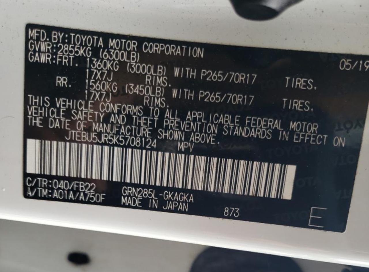 Колір БілийЦиліндри 6Привід 4x4 з заднім приводомVIN JTEBU5JR5K5708124Стан Заводиться та їде (перевірено)Ушкодження Задня