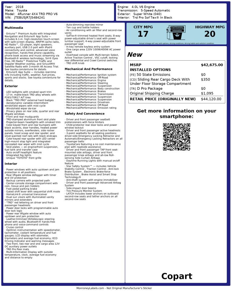 TOYOTA 4RUNNER 4.0 2018 р.в., 4x4 з заднім приводом (JTEBU5JR7J5484241) з США