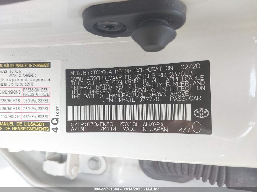 Колір БілийЦиліндри 4Привід Передній привідVIN JTNKHMBX1L1077778Стан СтаціонарноУшкодження Передня ліва