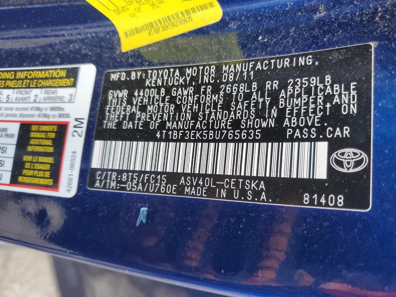 Колір СинійЦиліндри 4VIN 4T1BF3EK5BU765635Стан ЗаводитьсяУшкодження Передня або задня