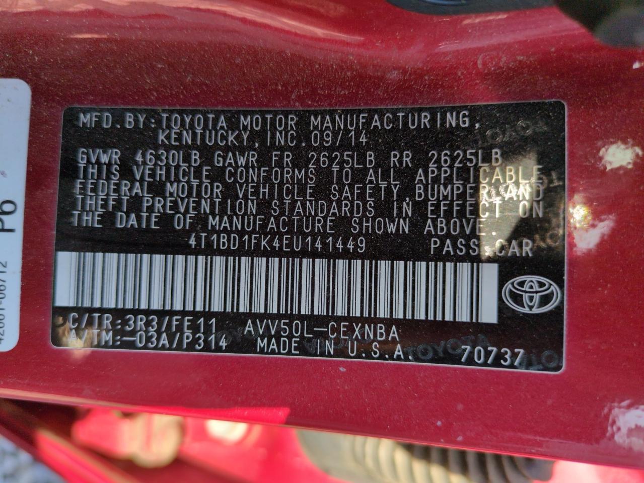 Колір ЧервонийЦиліндри 4VIN 4T1BD1FK4EU141449Стан НевідомоУшкодження Передня або задня
