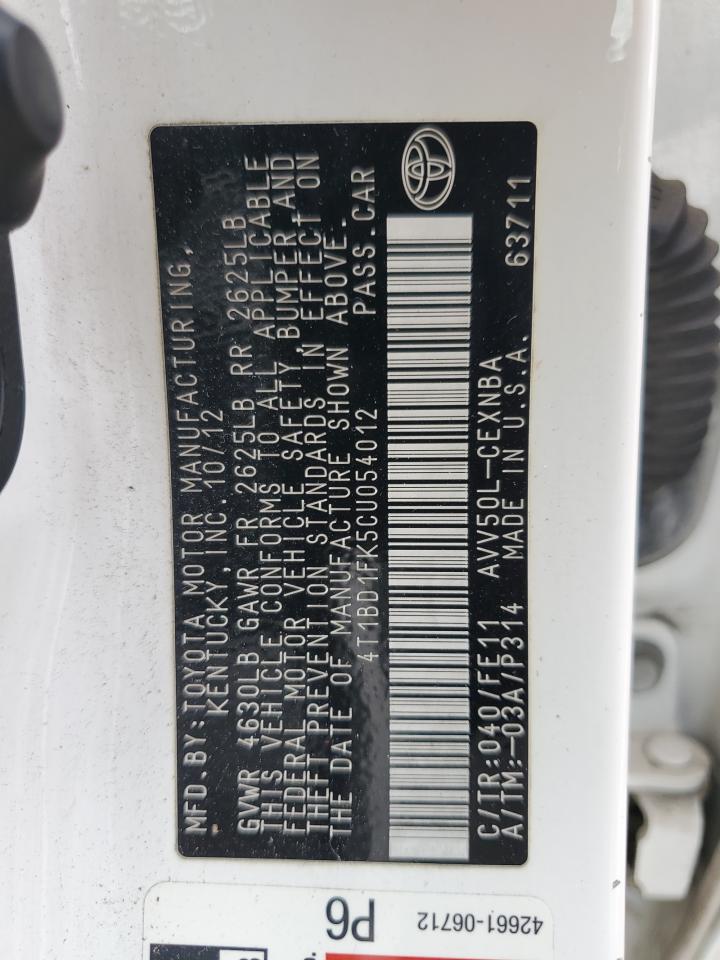 TOYOTA CAMRY HYBRID 2.5 2012 р.в., (4T1BD1FK5CU054012) з США