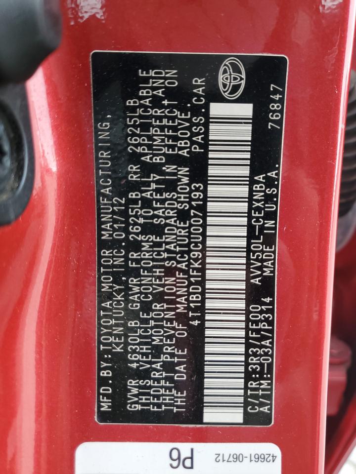 Колір ЧервонийЦиліндри 4VIN 4T1BD1FK9CU007193Стан НевідомоУшкодження Передня або задняДата аукціону 2025-11-03