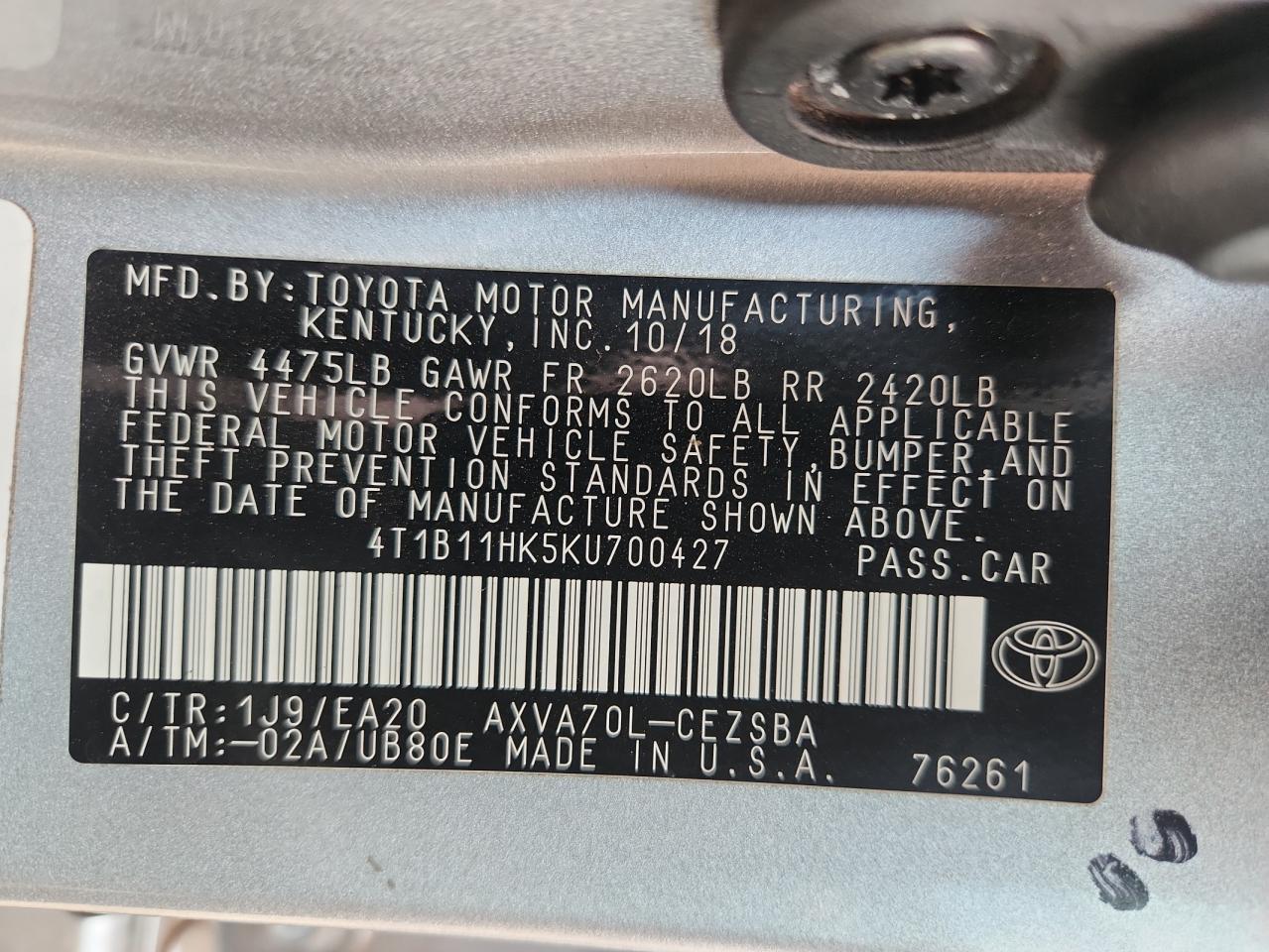 TOYOTA CAMRY 2.5 2019 р.в., (4T1B11HK5KU700427) з США