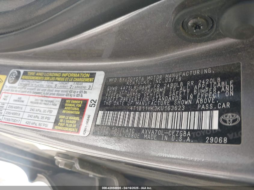 TOYOTA CAMRY 2.5 2019 р.в., Передній привід (4T1B11HK3KU163623) з США