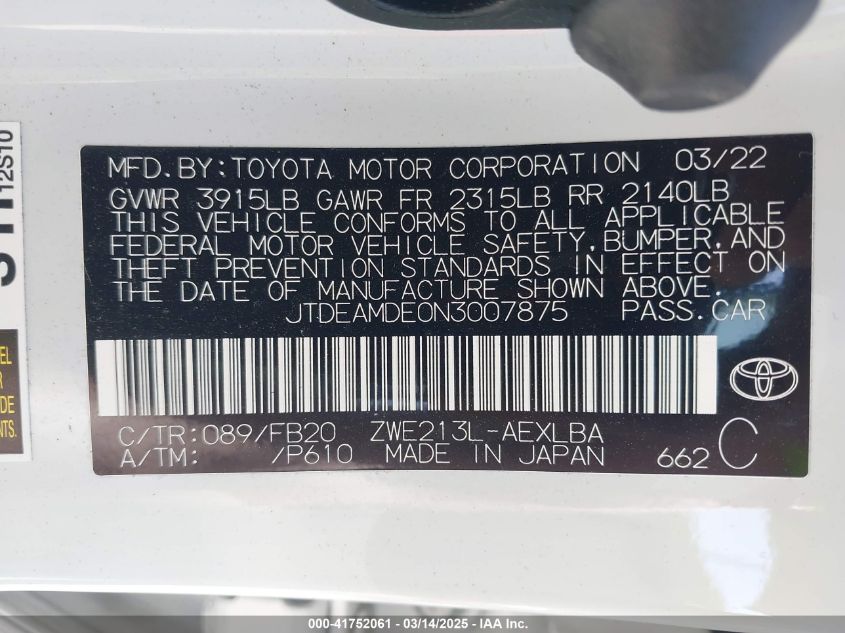 TOYOTA COROLLA 1.8 2022 р.в., Передній привід (JTDEAMDE0N3007875) з США