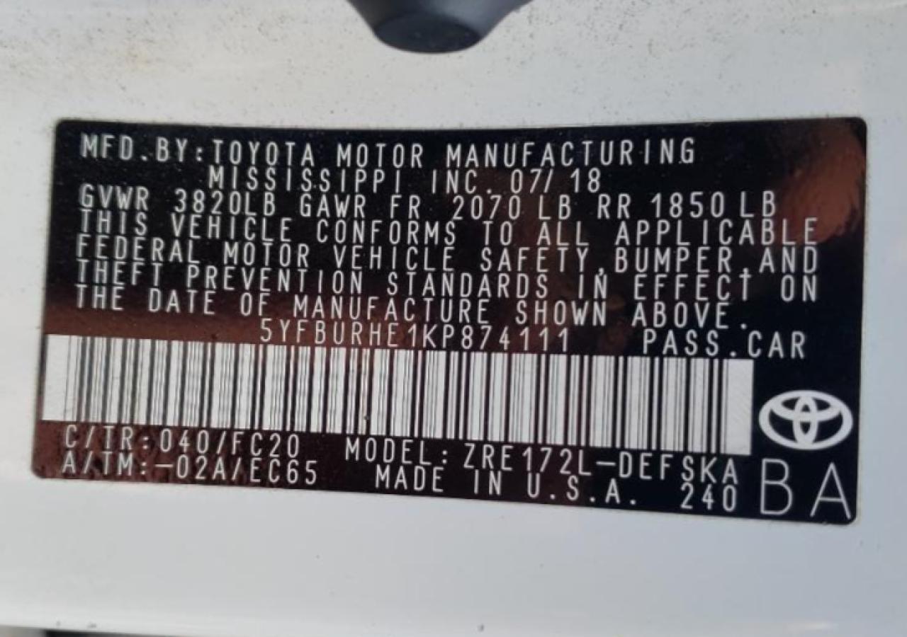 TOYOTA COROLLA 1.8 2019 р.в., (5YFBURHE1KP874111) з США