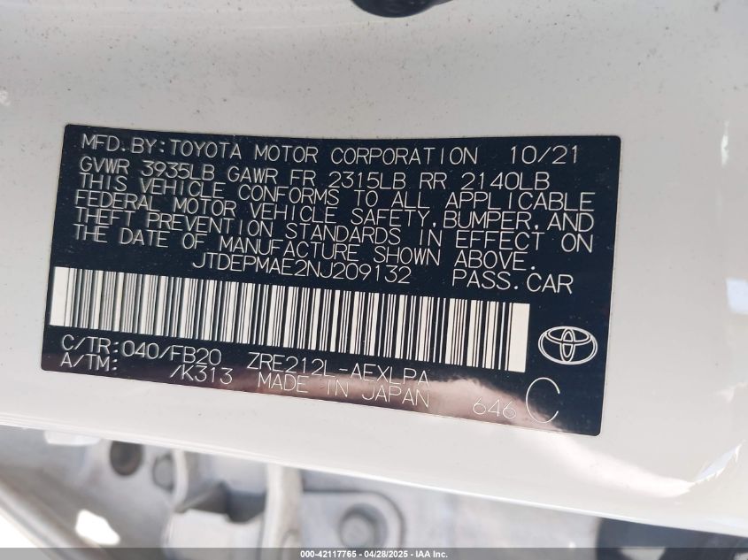 TOYOTA COROLLA 1.8 2022 р.в., Передній привід (JTDEPMAE2NJ209132) з США