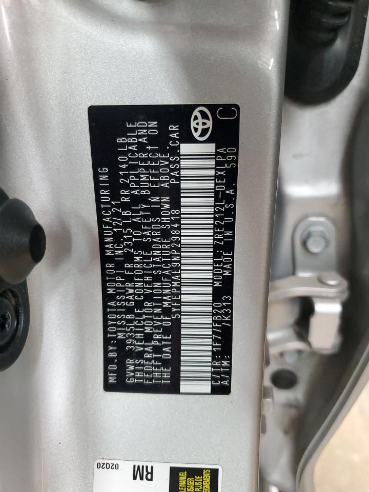 Колір СрібнийЦиліндри 4VIN 5YFEPMAE9NP298418Стан НевідомоУшкодження Передня або задня
