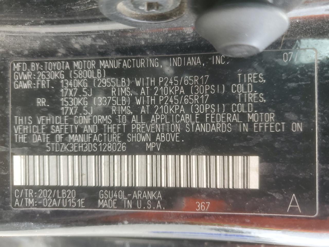 Колір ЧорнийЦиліндри 6VIN 5TDZK3EH3DS128026Стан Заводиться та їде (перевірено)Ушкодження Передня або задняДата аукціону 2025-11-03