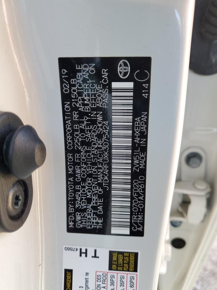 Колір БілийЦиліндри 4VIN JTDKARFUXK3075424Стан НевідомоУшкодження Передня або задня