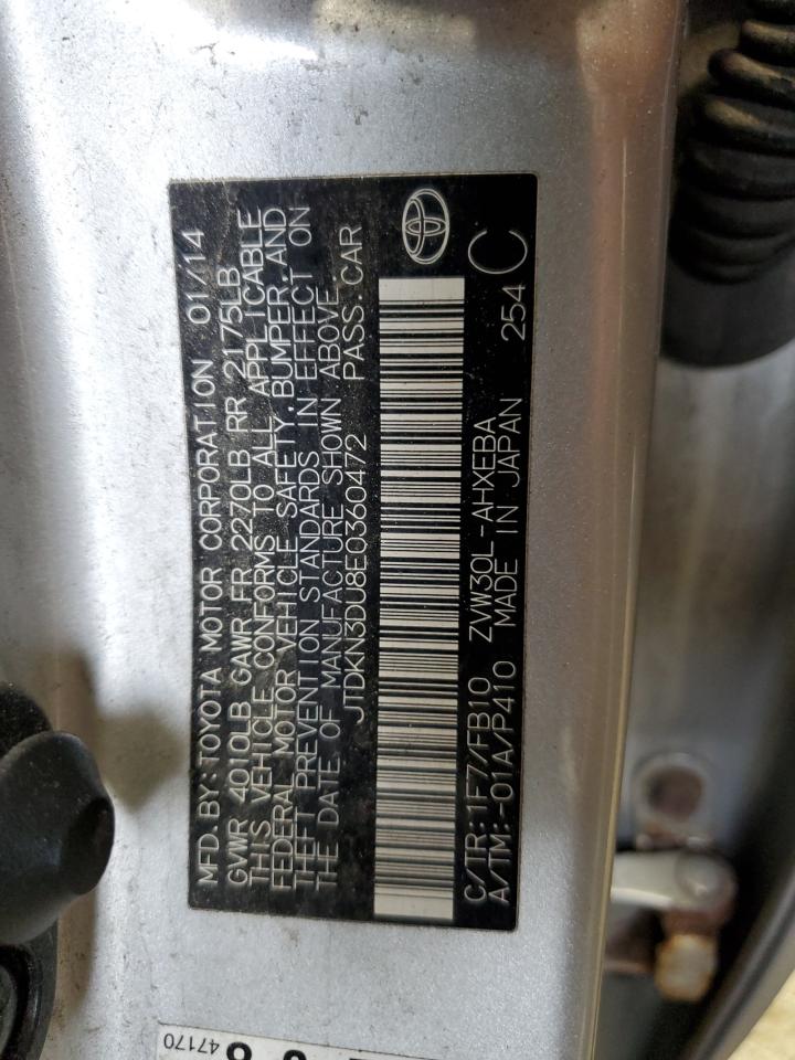Колір СрібнийЦиліндри 4VIN JTDKN3DU8E0360472Стан НевідомоУшкодження Передня або задня