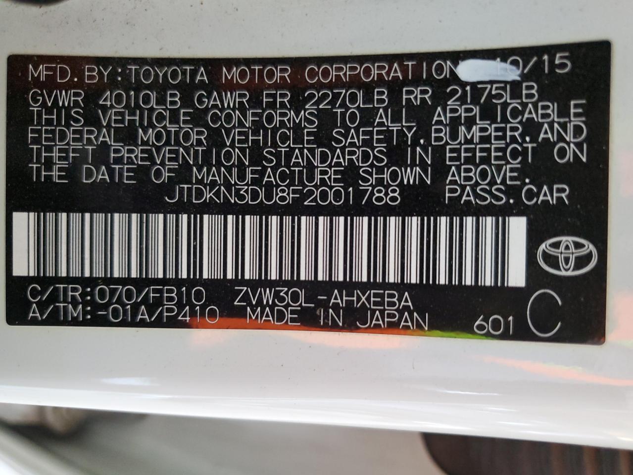 Колір БілийЦиліндри 4VIN JTDKN3DU8F2001788Стан Заводиться та їде (перевірено)Ушкодження Передня або задня