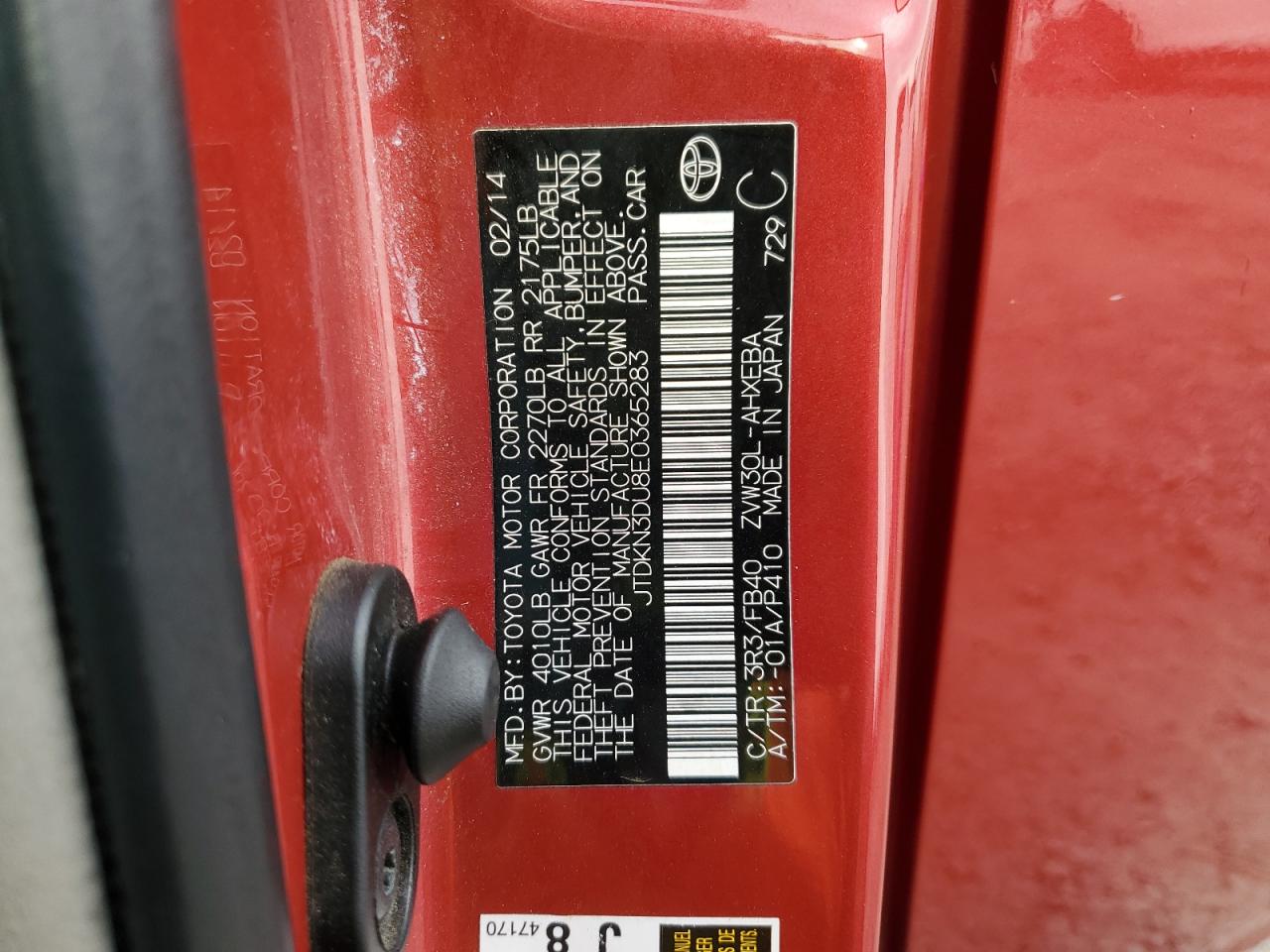 Колір ЧервонийЦиліндри 4VIN JTDKN3DU8E0365283Стан ЗаводитьсяУшкодження Передня або задня