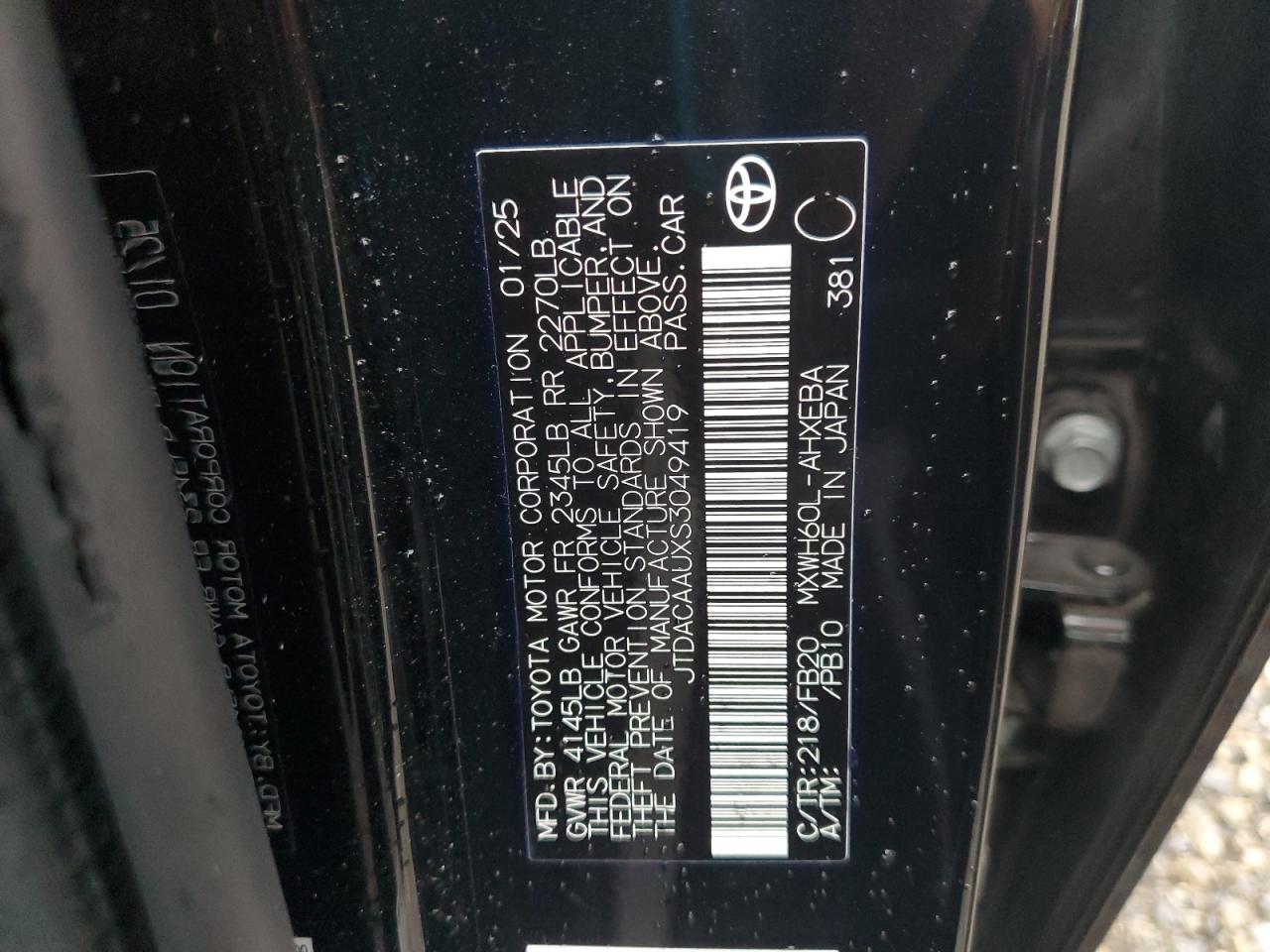 Колір ЧорнийЦиліндри 4VIN JTDACAAUXS3049419Стан НевідомоУшкодження Передня або задняДата аукціону 2025-11-07