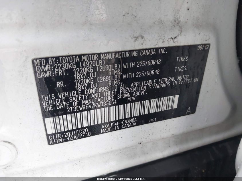 TOYOTA RAV4 HYBRID 2.5 2019 р.в., Повний привід (2T3EWRFV7KW033054) з США