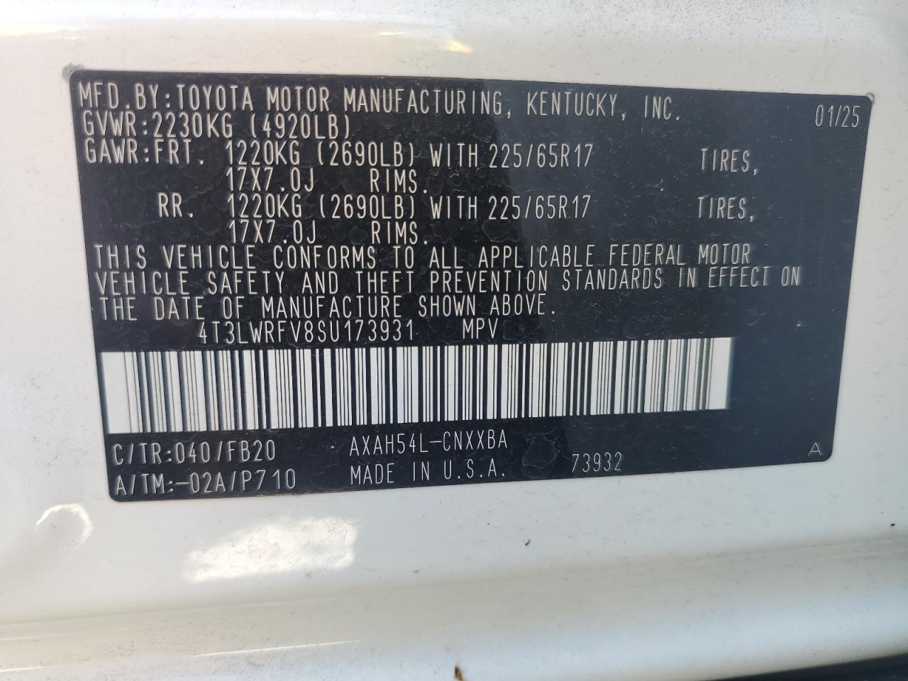 Колір БілийЦиліндри 4Привід Повний привідVIN 4T3LWRFV8SU173931Стан НевідомоУшкодження Передня або задняДата аукціону 2025-11-03