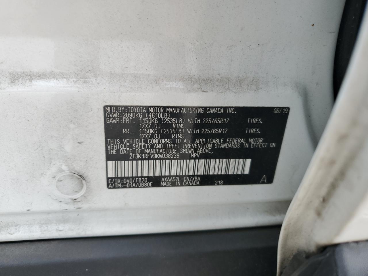 TOYOTA RAV4 2.5 2019 р.в., (2T3K1RFV9KW038239) з США