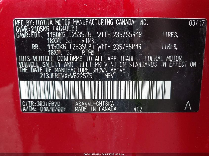 TOYOTA RAV4 2.5 2017 р.в., Повний привід (2T3JFREVXHW622575) з США