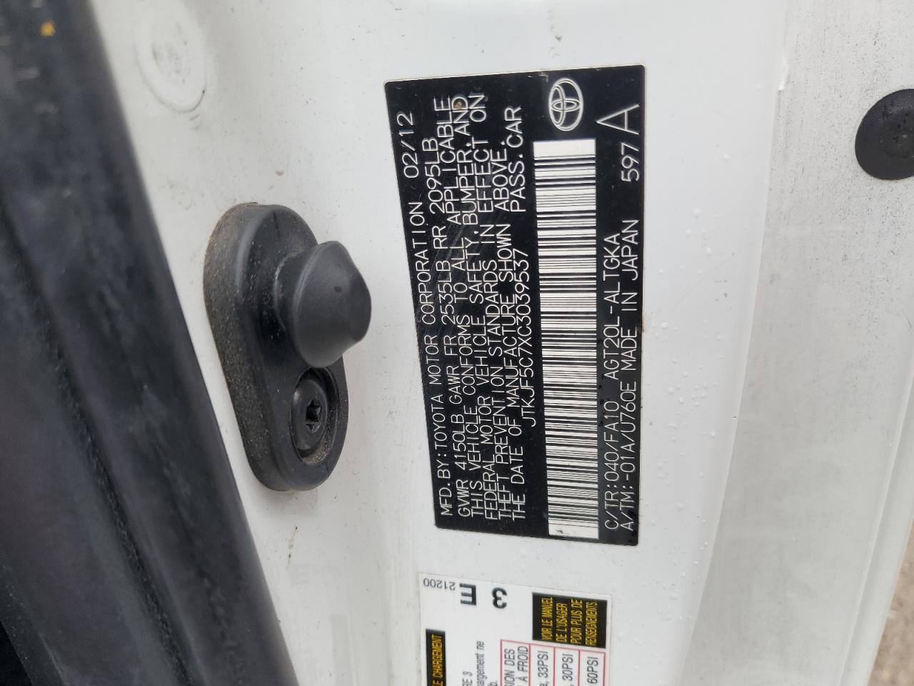 Колір БілийЦиліндри 4VIN JTKJF5C7XC3039537Стан НевідомоУшкодження Задня