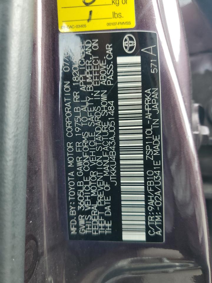 Колір ФіолетовийЦиліндри 4VIN JTKKU4B43AJ051484Стан Заводиться та їде (перевірено)Ушкодження Передня або задня