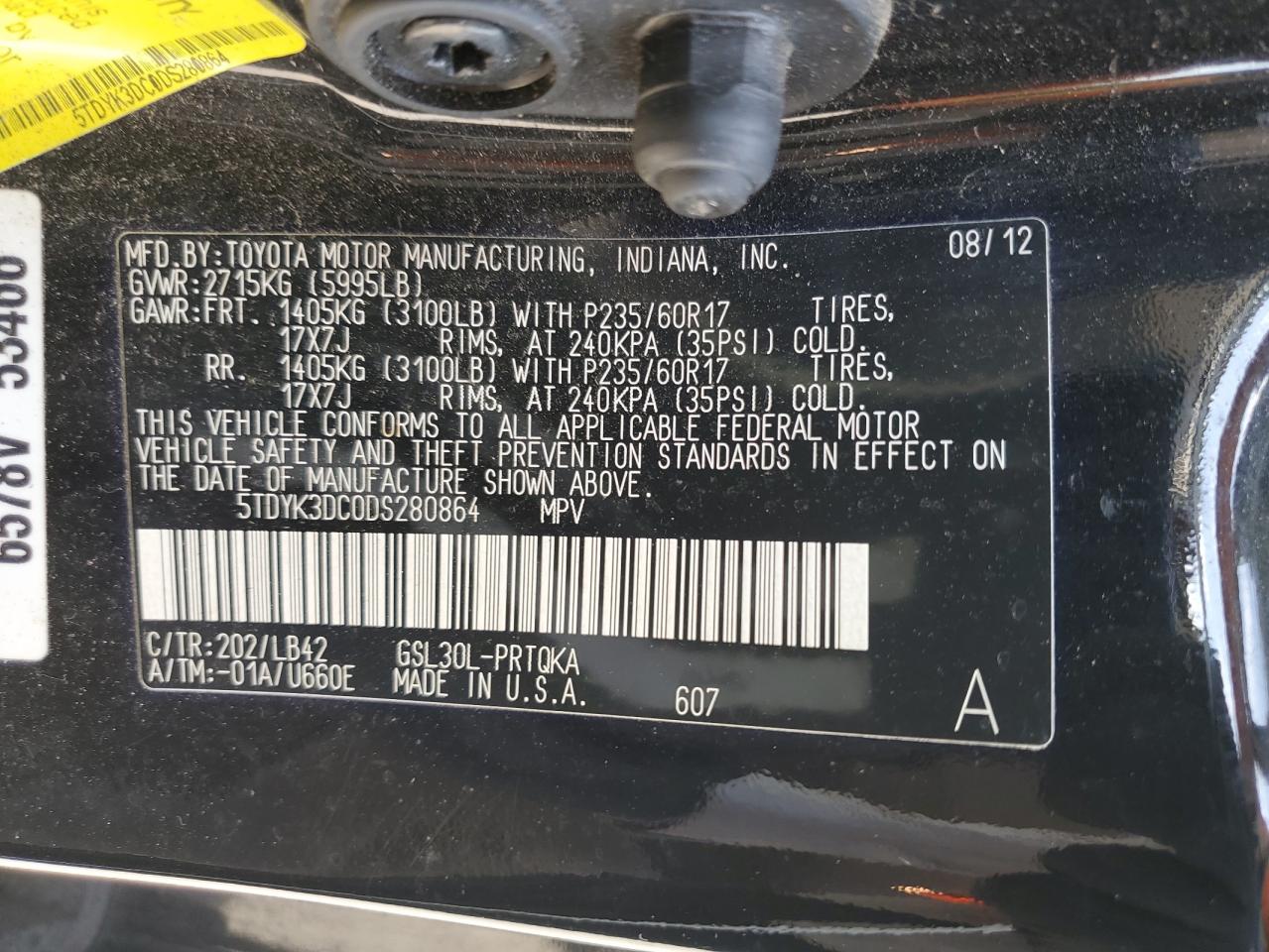 Колір ЧорнийЦиліндри 6VIN 5TDYK3DC0DS280864Стан Заводиться та їде (перевірено)Ушкодження Передня або задняДата аукціону 2025-11-03