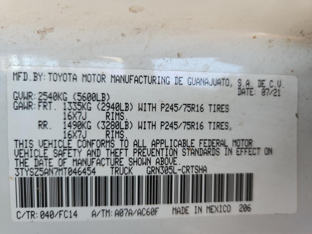 Колір БілийЦиліндри 6Привід 4x4 з заднім приводомVIN 3TYSZ5AN7MT046454Стан Заводиться та їде (перевірено)Ушкодження Передня або задняДата аукціону 2025-11-05