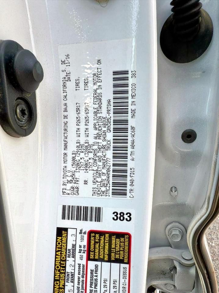 Колір БілийЦиліндри 6Привід 4x4 з заднім приводомVIN 3TMCZ5AN4HM062777Стан Заводиться та їде (перевірено)Ушкодження НезначніДата аукціону 2025-11-03