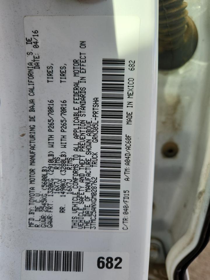 Колір БілийЦиліндри 6Привід 4x4 з заднім приводомVIN 3TMCZ5ANXGM028762Стан НевідомоУшкодження Передня або задня