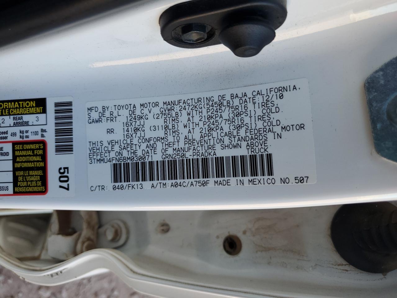 Колір БілийЦиліндри 6Привід 4x4 з заднім приводомVIN 3TMMU4FN6BM030071Стан Заводиться та їде (перевірено)Ушкодження Передня або задня