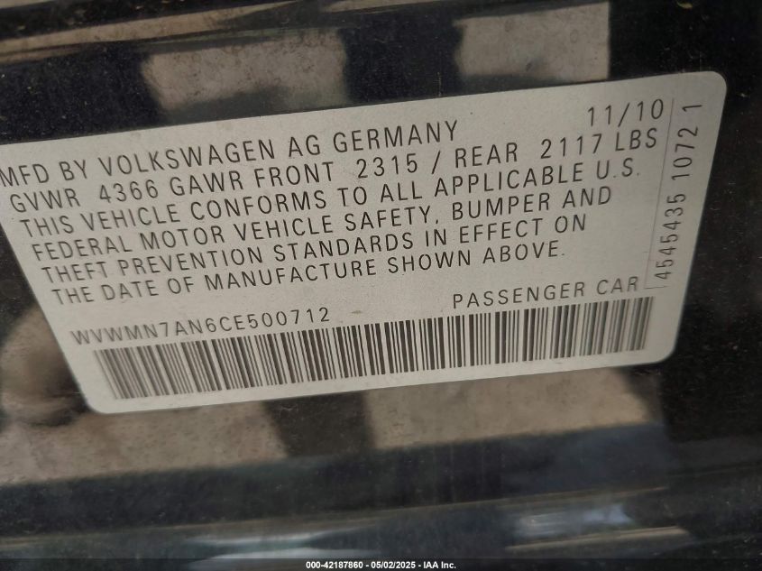 VOLKSWAGEN CC 2.0 2012 р.в., Передній привід (WVWMN7AN6CE500712) з США