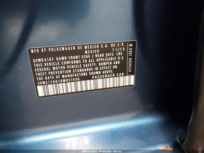 VOLKSWAGEN GOLF 1.8 2016 р.в., Передній привід (3VW217AU1GM031536) з США
