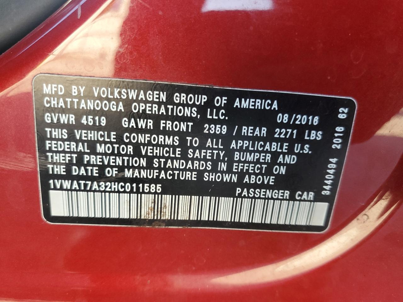 Колір ЧервонийЦиліндри 4VIN 1VWAT7A32HC011585Стан Заводиться та їде (перевірено)Ушкодження З боків