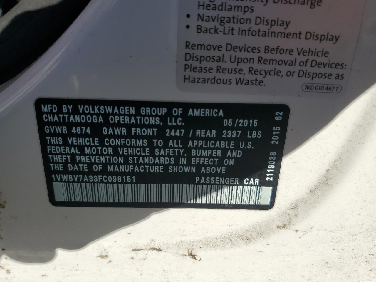 VOLKSWAGEN PASSAT 2.0 2015 р.в., (1VWBV7A33FC098151) з США