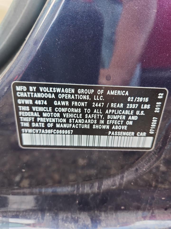 VOLKSWAGEN PASSAT 2.0 2015 р.в., (1VWCV7A36FC069957) з США