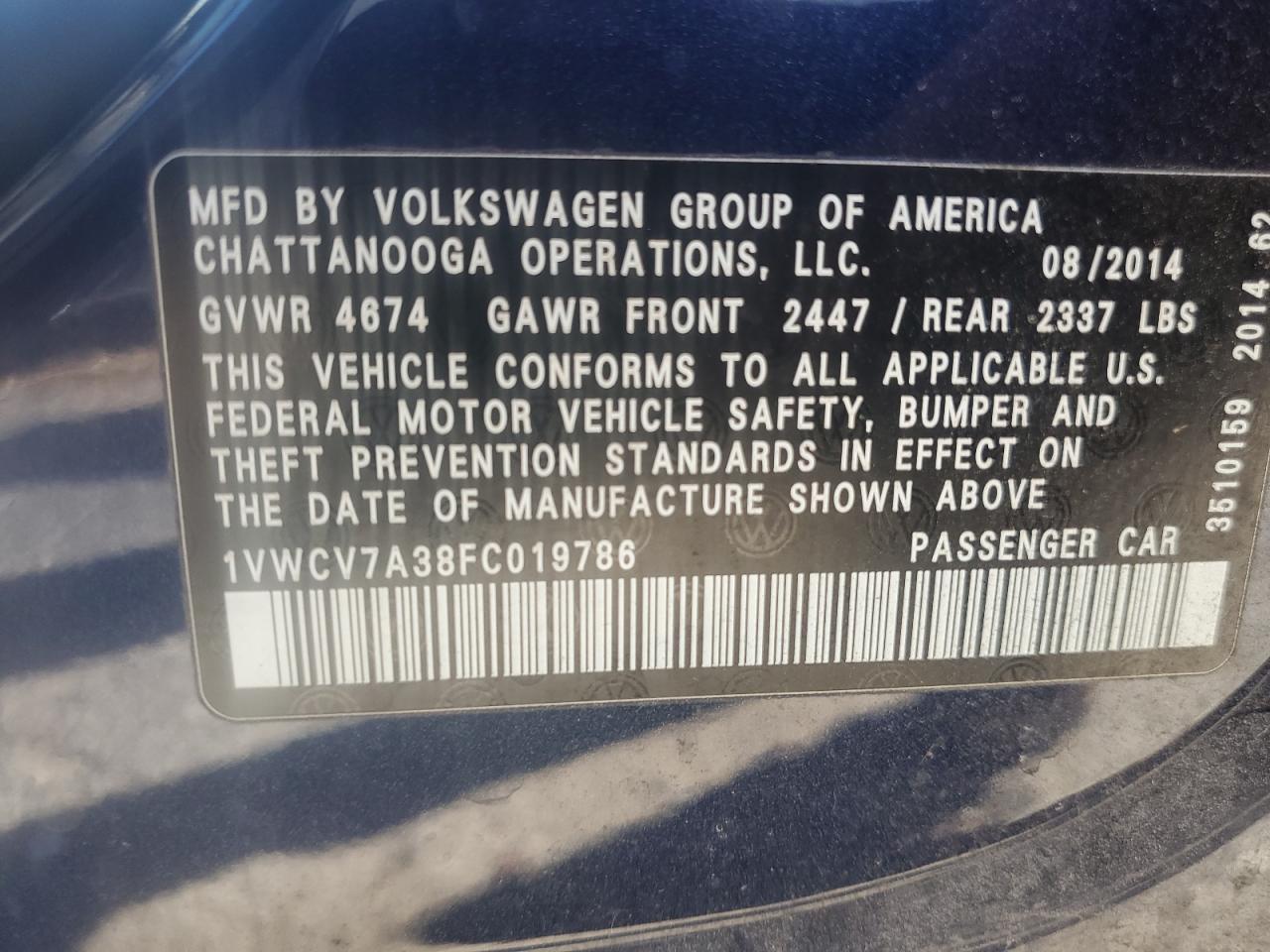 VOLKSWAGEN PASSAT 2.0 2015 р.в., (1VWCV7A38FC019786) з США