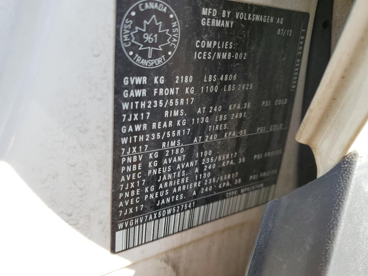 VOLKSWAGEN TIGUAN 2.0 2013 р.в., (WVGHV7AX5DW527541) з США