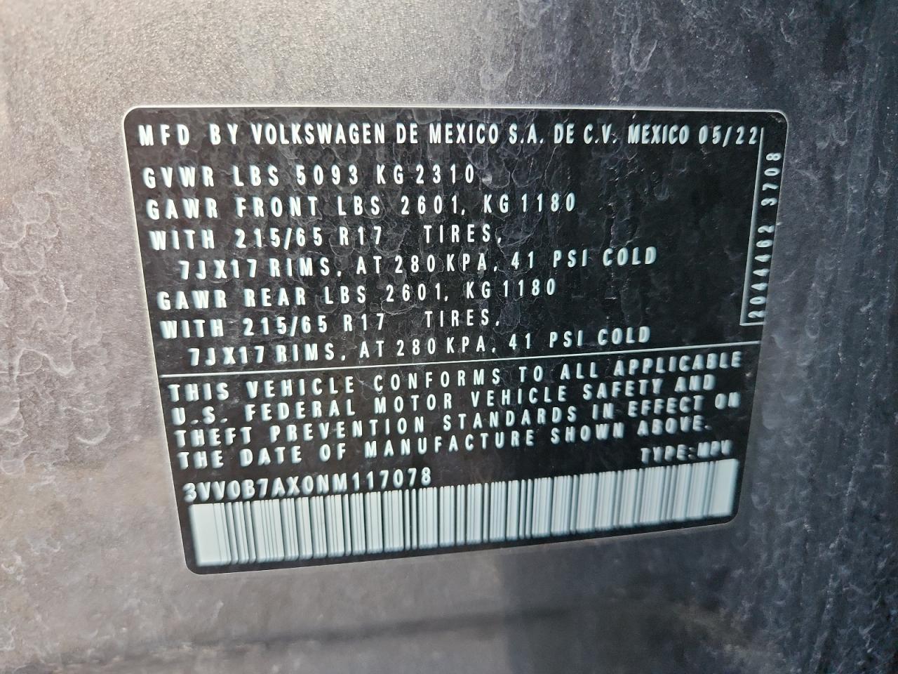 VOLKSWAGEN TIGUAN 2.0 2022 р.в., Повний привід (3VV0B7AX0NM117078) з США