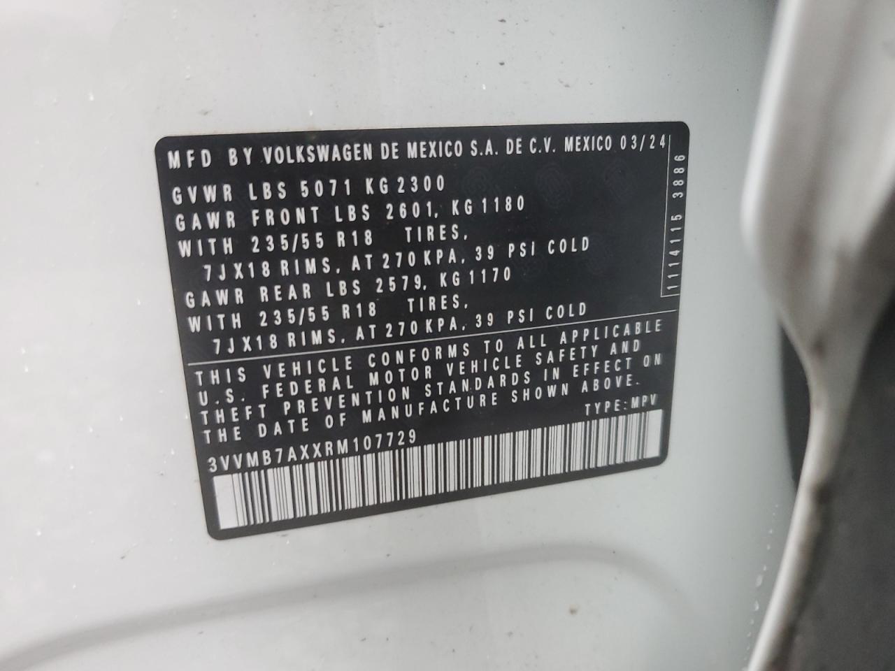 VOLKSWAGEN TIGUAN 2.0 2024 р.в., Повний привід (3VVMB7AXXRM107729) з США
